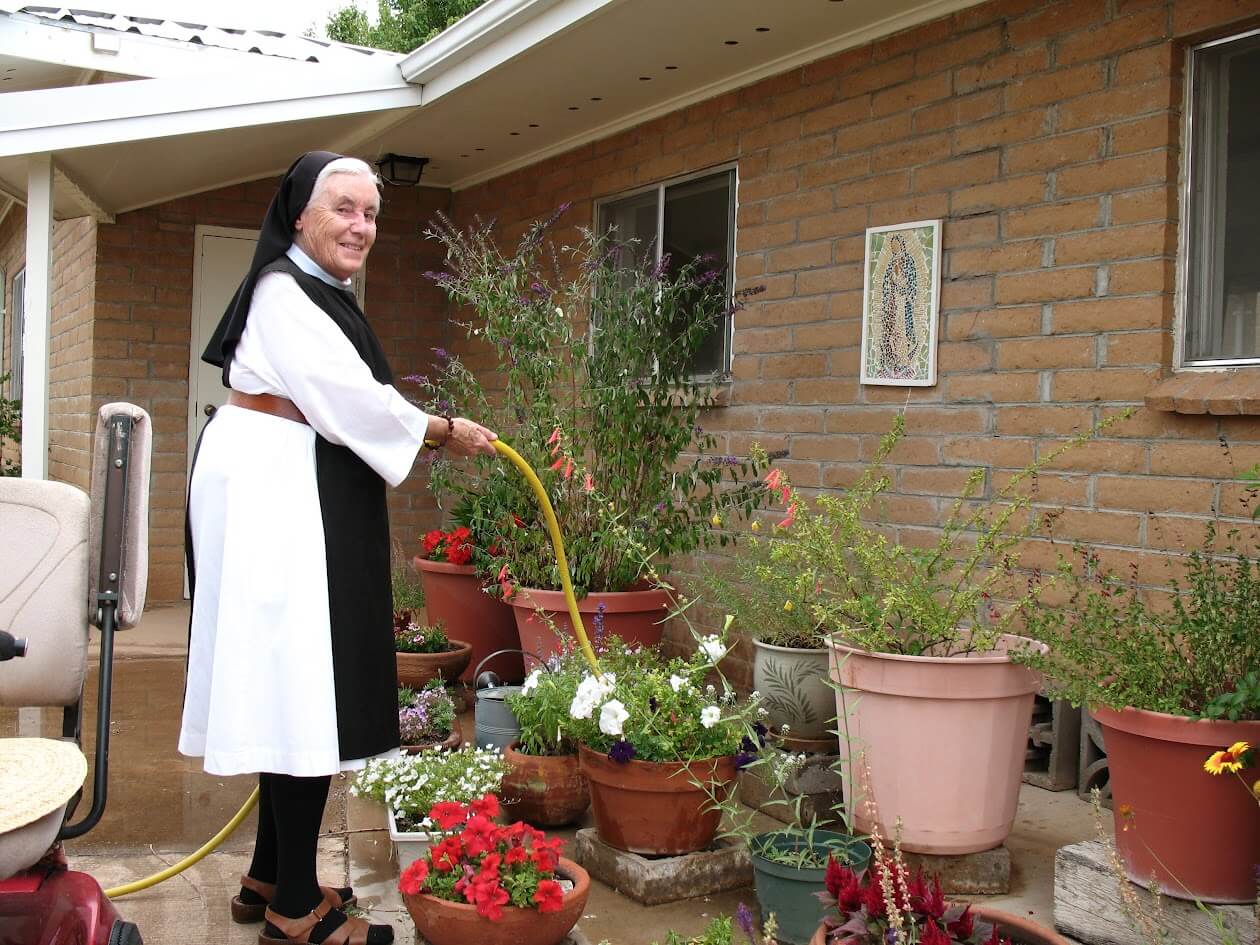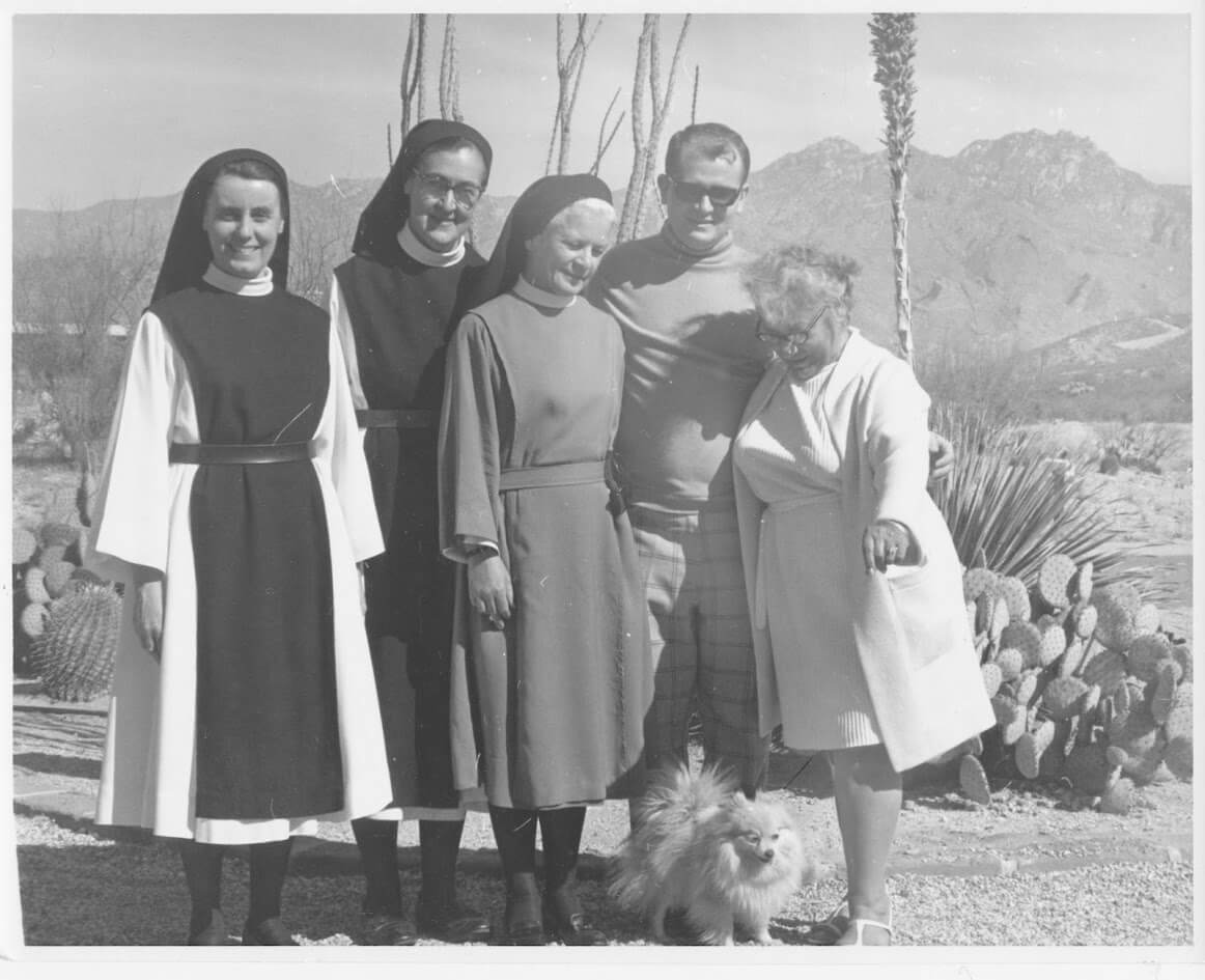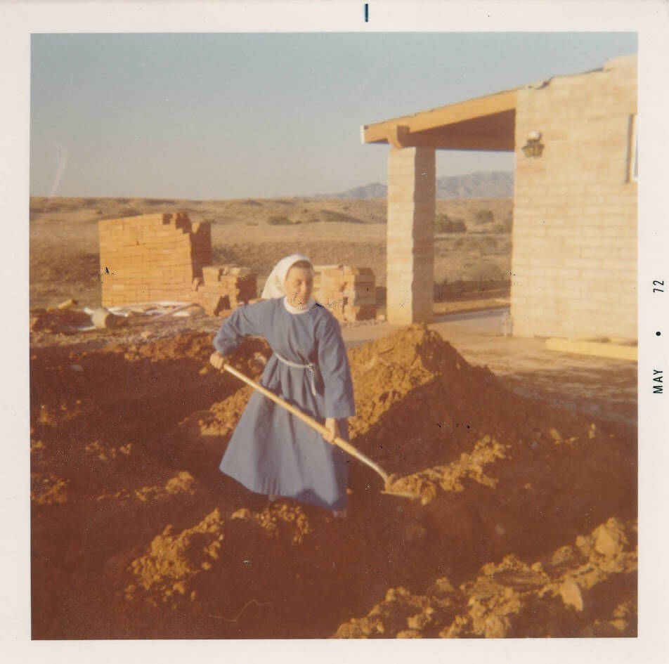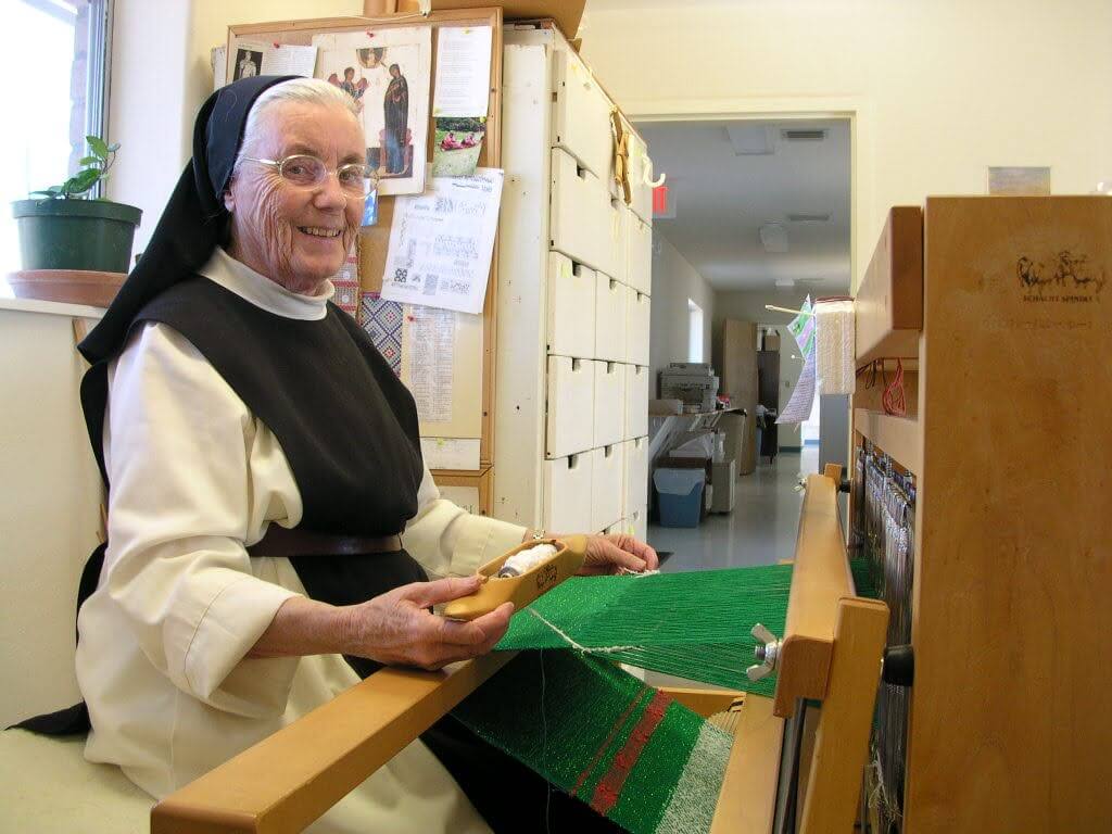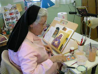 In 1972 she arrived in Sonoita, AZ as one of six foundresses of Santa Rita Abbey. To use her own words, “In 1972 I came to AZ. It was love at first sight. I worked as bookkeeper, sub-prioress and making stained glass novelties. Later I learned iconography and weaving and … the ever-present job of portress.”