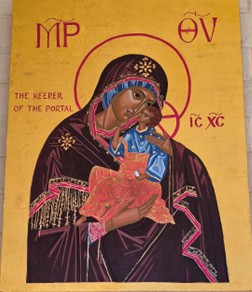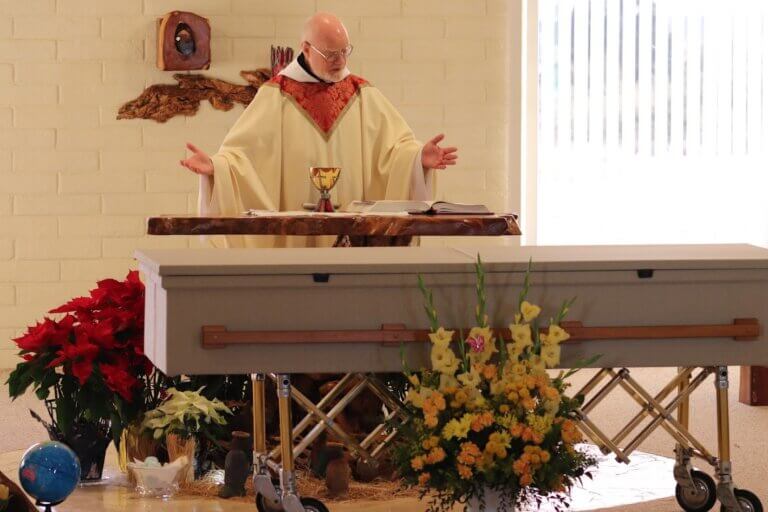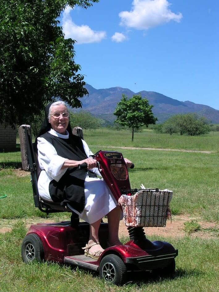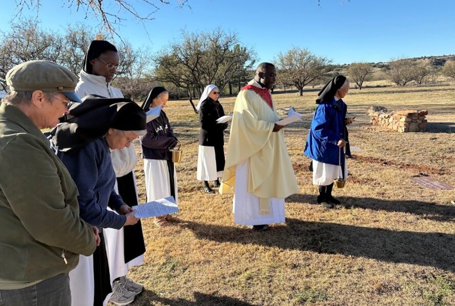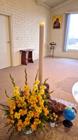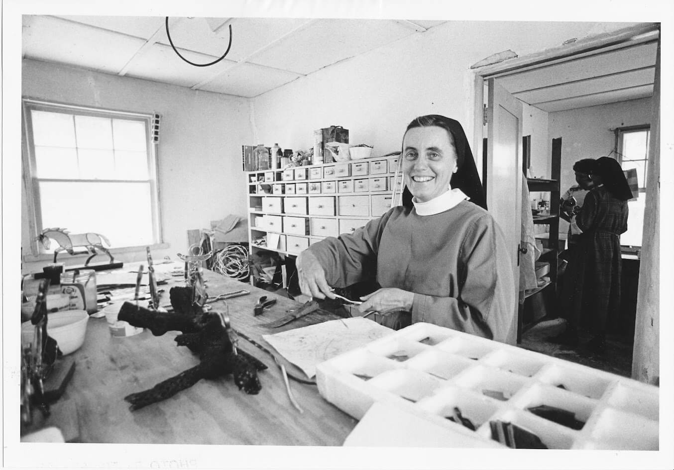 In 1972 she arrived in Sonoita, AZ as one of six foundresses of Santa Rita Abbey. To use her own words, “In 1972 I came to AZ. It was love at first sight. I worked as bookkeeper, sub-prioress and making stained glass novelties. Later I learned iconography and weaving and … the ever-present job of portress.”